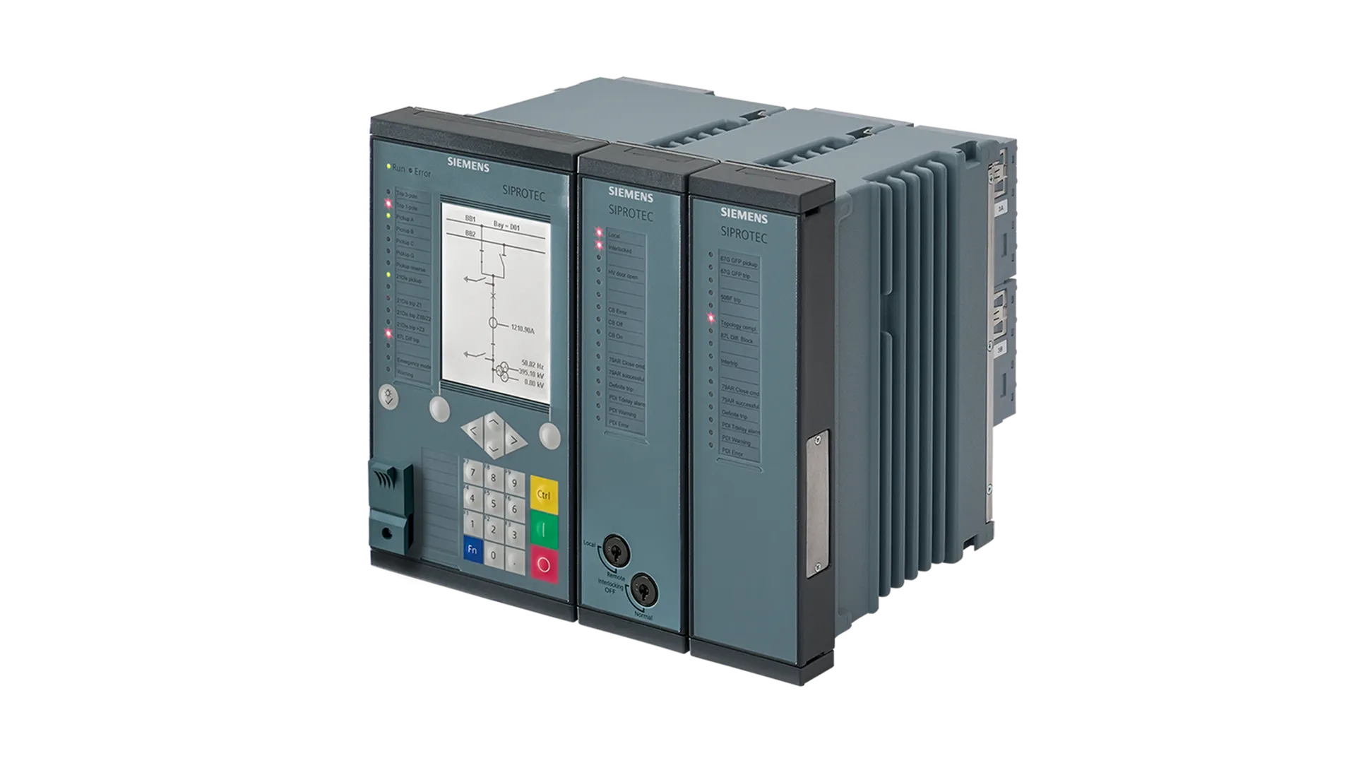- Flexibly adjustable and expandable I/O quantity structure within the scope of the modular SIPROTEC 5 system; 1/6 expansion modules can be added, available with large or small display, or without display